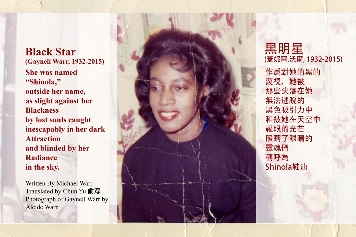 When I show people this photograph of my mother, their response is often the same as mine when I first saw it: "She looks like a movie star." Yet, when she was growing up kids would call her "Shinola," after the shoe polish, as an insult referring to how dark she was. I kept this poem to one stanza so that the focus would be on her beauty. The poem appears here in English and Mandarin. When the poet Chun Yu started translating the poem she quickly ran into trouble with the word "Shinola." Find out how she resolved it in Shinola.